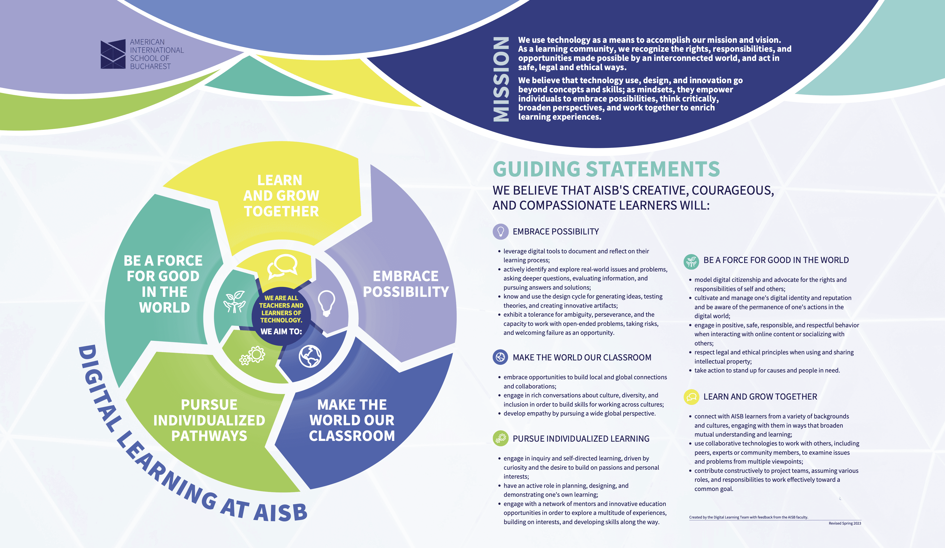 With the Digital Learning Team, G established and maintained key educational resources including Tech Bytes, a weekly newsletter launched in January 2021 that continues to serve as a cornerstone of AISB's professional development. The team created hundreds of tutorials and carefully curated resources that built staff confidence in educational technology and visual communication.